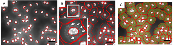 单通道影像获取,利用四通道进行荧光检(DAPI,FITC,Rhodamin,Cy5),每个影像包含将近50-200个细胞,并且扫描部分图像自动拼接。每个荧光通道的影像和多个FOV都能够被自动获取,收集和后期的组合。(A) 利用参数调节识别细胞核(B) 创建ring mask (C) ring mask中黄色高亮部分为自动筛选ROI中病原体