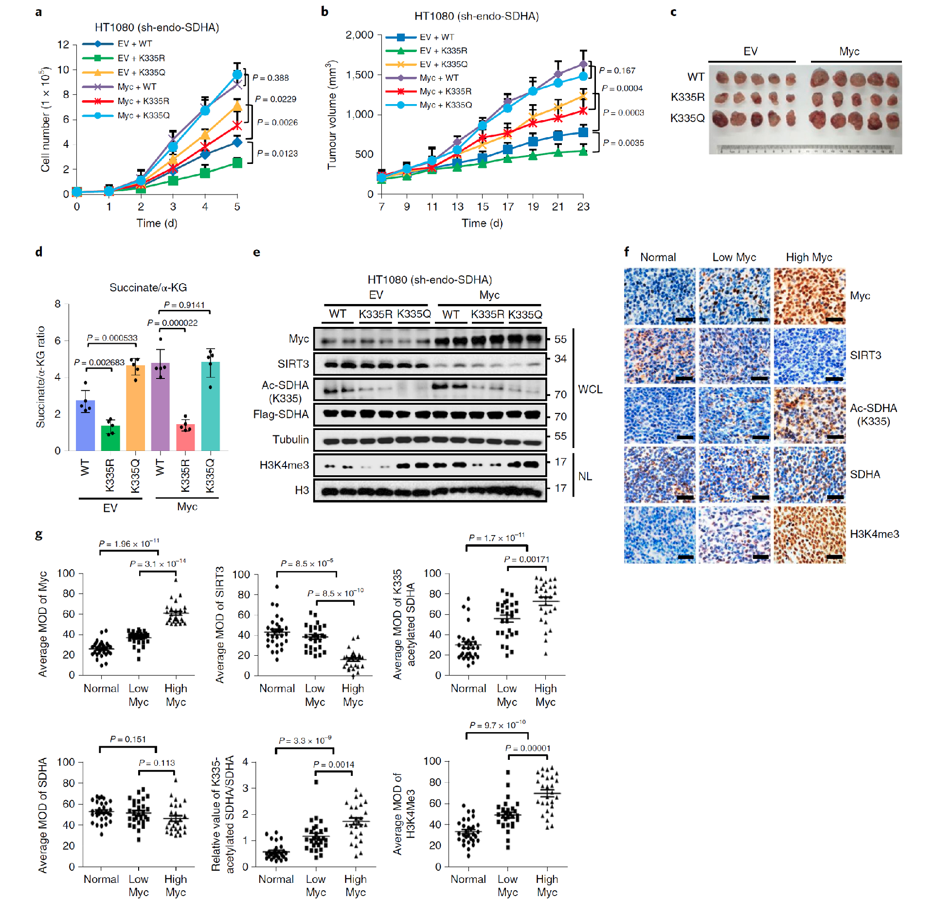 实验揭示了cMyc驱动的肿瘤发生过程中SDHA乙酰化修饰发挥的重要病理学作用。SDHA被认为是抑癌蛋白,它的失活突变体与多种肿瘤,例如副神经结瘤、乳腺癌、肾癌等,有一定程度的联系。