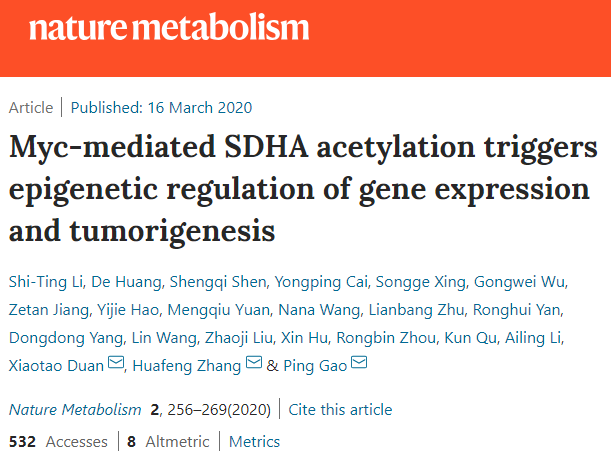 中国科学技术大学张华凤课题组、高平课题组联合军事医学科学院段小涛课题组研究发现,cMyc能够促使琥珀酸脱氢复合酶(SDH complex)中的重要亚基SDHA乙酰化以及SDH复合酶失活,导致底物琥珀酸(succinate)的积累,进而上调组蛋白H3K4的三甲基化(H3K4Me3)水平以及基因的表达。机制方面,发现cMyc通过泛素连接酶SKP2促进线粒体中SIRT3的蛋白降解,从而导致SDHA的乙酰化水平上升。