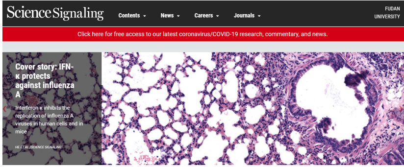 2020年4月7日,复旦大学生物医学研究院/上海市公共卫生临床中心徐建青与张晓燕教授联合执导的研究团队在Science子刊Science Signaling杂志上发表题为“IFN-κ suppresses the replication of influenza A viruses through the IFNAR-MAPK-Fos-CHD6 axis”的研究文章,并获得当期特色文章的封面推介。