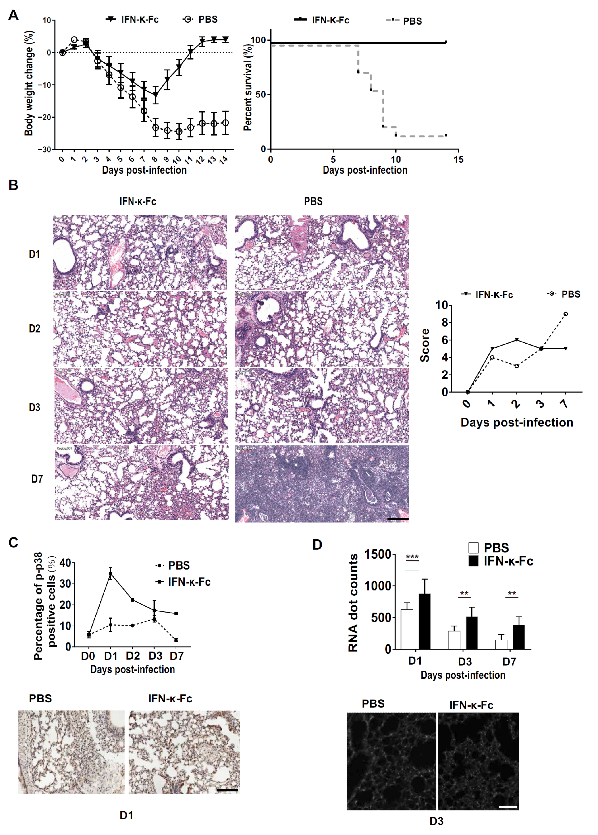 (C)IFN-κ-Fc和PBS治疗组中肺组织中p-p38的IHC图像及定量分析结果,可见在D1中,IFN-κ-Fc达到顶峰,以及在D0-D7中显著高于PBS治疗组。