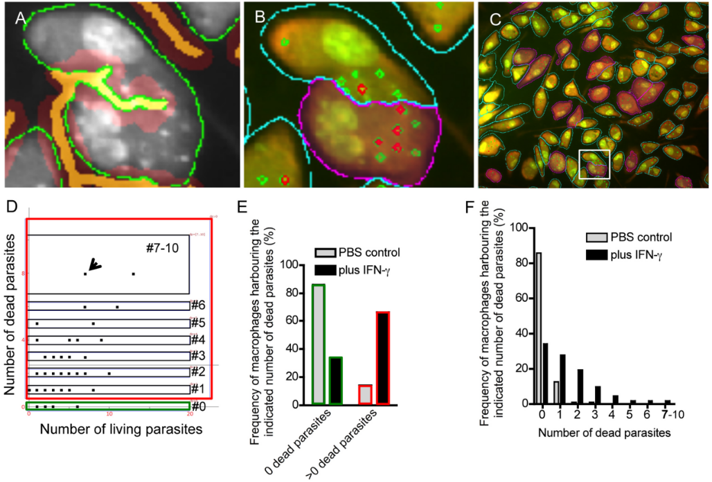 (A) AO灰阶图用于薄膜的检测(绿色),细胞边缘的确定(橘色)。(B) 对粘连细胞进行详细分析。(C) 反向回溯确定巨噬细胞拥有多于2个失活寄生虫。(E) 拥有失活寄生虫的巨噬细胞的频率分析。(F)拥有不同数量失活寄生虫的吞噬细胞的频率分析。