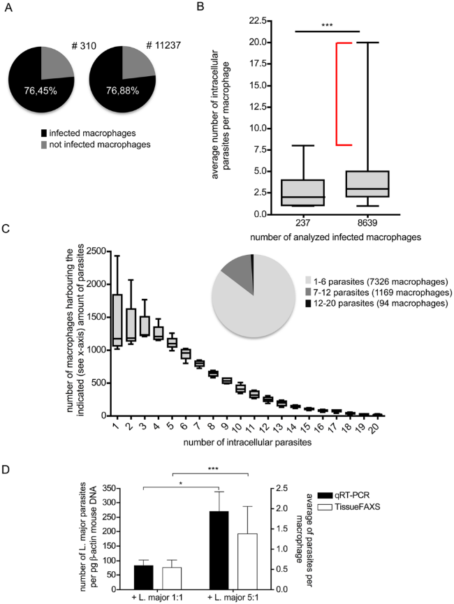 (A)软件自动计算感染与未感染的巨噬细胞。(B)每个巨噬细胞胞内寄生虫的平均数量的定量分析。在分析了237个与8639个细胞后,得出随即选择的样本足以证明总感染比例的正确性。(C)胞内寄生虫与巨噬细胞的关系。胞内病原体的数量和Y轴相应的病原体对应的巨噬细胞拥有病原体的数量区间。