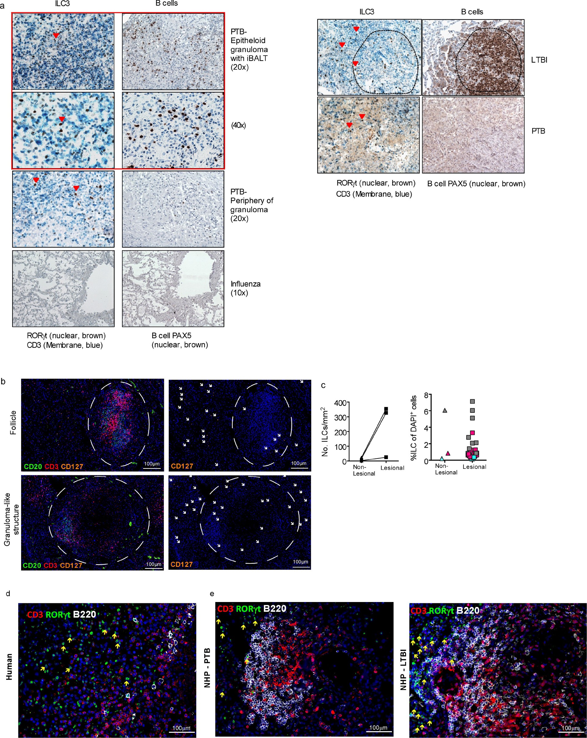 D:患有肺结核(d)的人肺组织样本,患有肺结核(PTB)和潜伏性结核感染(LTBI)的猕猴(e)肺样本和(RORγt,B220和CD3)。